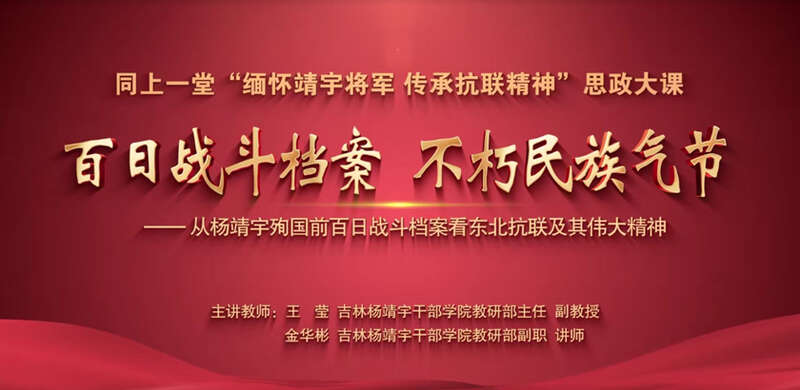 本次思政大课由中共吉林省委教育工委、吉林省教育厅、吉林杨靖宇干部学院联合人民网共同举办。吉林杨靖宇干部学院教研部主任、副教授王莹,吉林杨靖宇干部学院教研部副职、讲师金华彬担任主讲。课程以《百日战斗档案 不朽民族气节——从杨靖宇殉国前百日战斗档案看东北抗联及其伟大精神》为主题,带领全省学生回顾东北抗联历史,走进伟大的杨靖宇将军,深刻感悟东北抗联精神,汲取磅礴奋进力量。