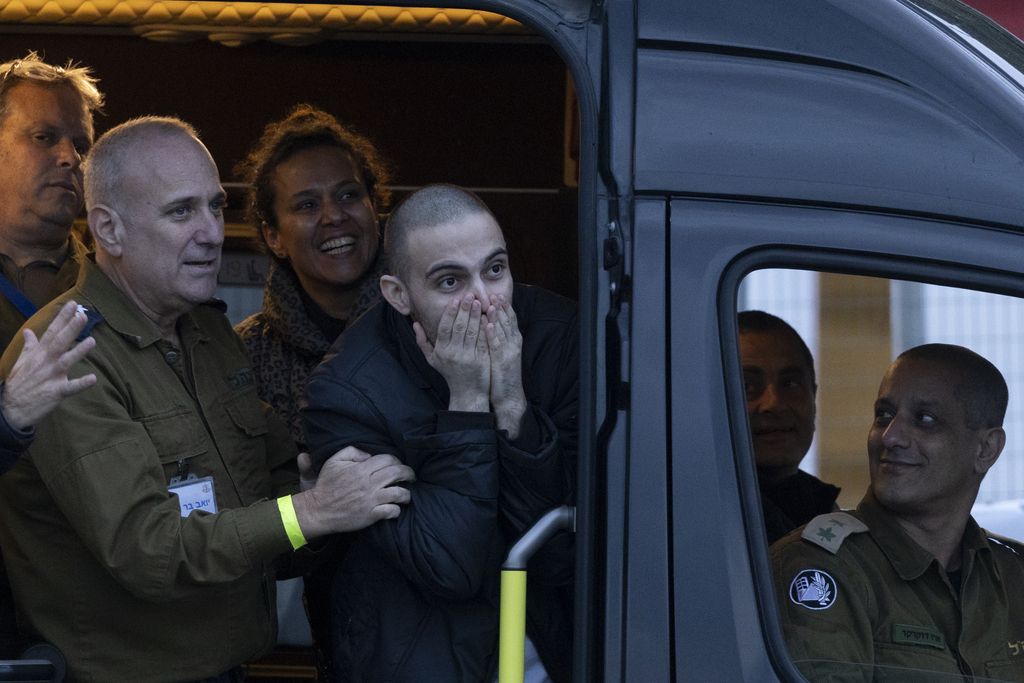 当地时间2025年2月22日,以色列彼特马提夫,获释人质欧默·温克特抵达贝林森医院。今天被哈马斯释放的六名人质分别是塔尔·肖哈姆、欧默·谢姆-托夫、伊利亚·科恩、欧默·温克特、阿维拉·孟基斯图和希沙姆·阿尔-赛义德。作为双方停火协议的一部分,以色列预计将释放超过600名巴勒斯坦囚犯。