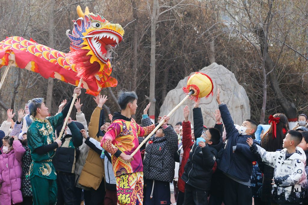 2025年2月23日,青海省西宁市中小学生正式迎来2025年春季学期。图为在西宁市桃李小学,学生在开学典礼上与舞龙表演者互动。 中新社记者 马铭言 摄