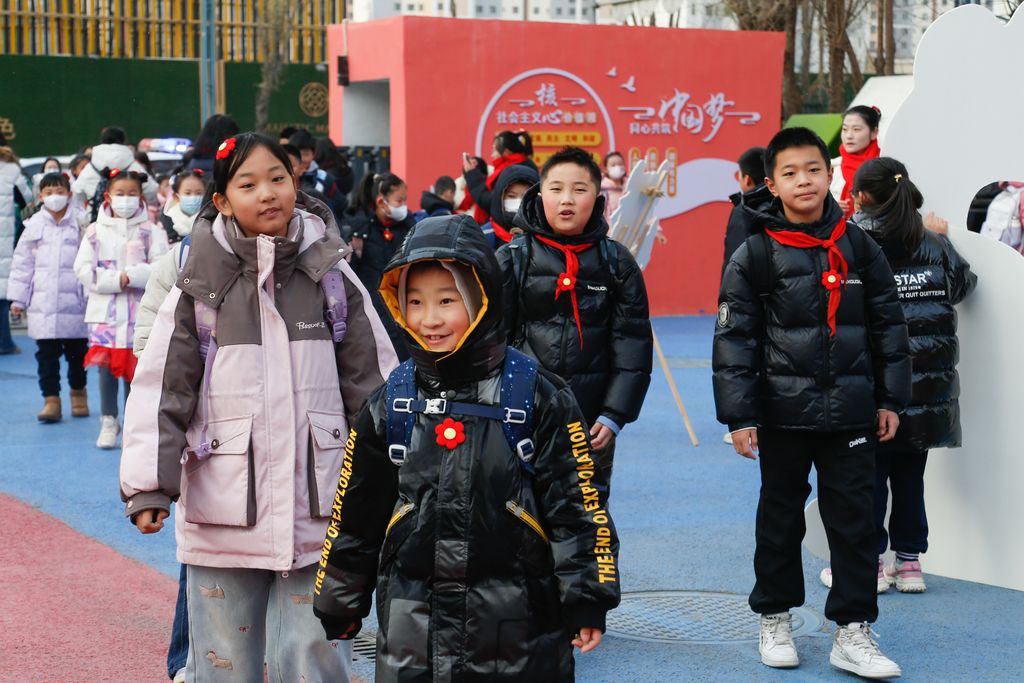 2025年2月23日,青海省西宁市中小学生正式迎来2025年春季学期。图为在西宁市桃李小学,学生们陆续走进校园,迎接新学期。 中新社记者 马铭言 摄