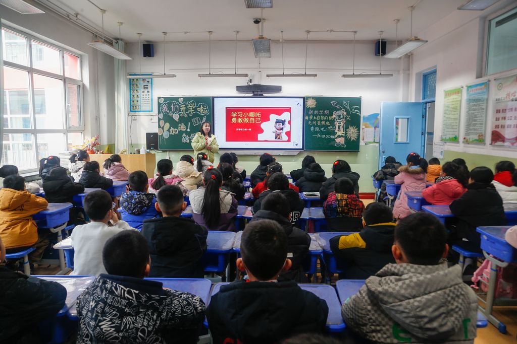 2025年2月23日,青海省西宁市中小学生正式迎来2025年春季学期。图为在西宁市桃李小学,老师给学生上开学第一课。 中新社记者 马铭言 摄