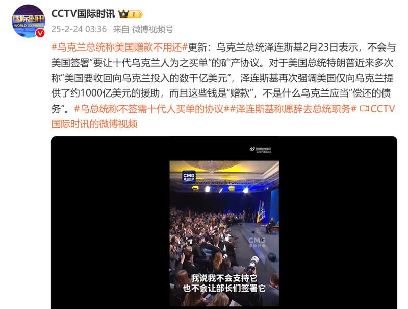 据CCTV国际时讯,乌克兰总统泽连斯基在2月23日于基辅举行的“乌克兰2025年论坛”上表示,如果能带来和平,他愿意辞去总统职务,或者用他的辞职换取乌克兰加入北约。