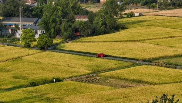 寒假前夕,深圳信息职业技术学院无人机专业2022级学生李想随学校测绘队在四川省德阳市乡村进行多光谱测绘时捕捉到的景象。画面中,一辆红色汽车正沿着蜿蜒的乡村道路行驶,道路两旁是金黄色的成熟稻田,呈现出丰收的景象。受访者供图