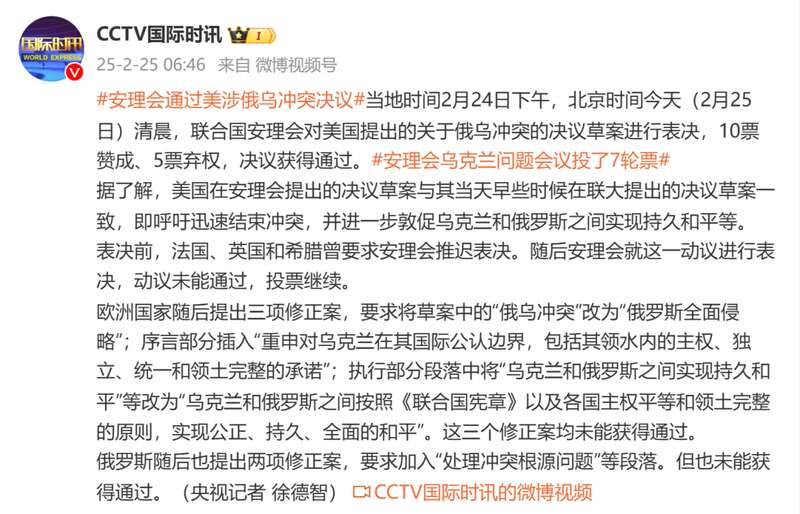 据CCTV国际时讯,北京时间今天(2月25日)清晨,联合国安理会对美国提出的关于俄乌冲突的决议草案进行表决,10票赞成、5票弃权,决议获得通过。美国在安理会提出的决议草案与其当天早些时候在联大提出的决议草案一致,即呼吁迅速结束冲突,并进一步敦促乌克兰和俄罗斯之间实现持久和平等。