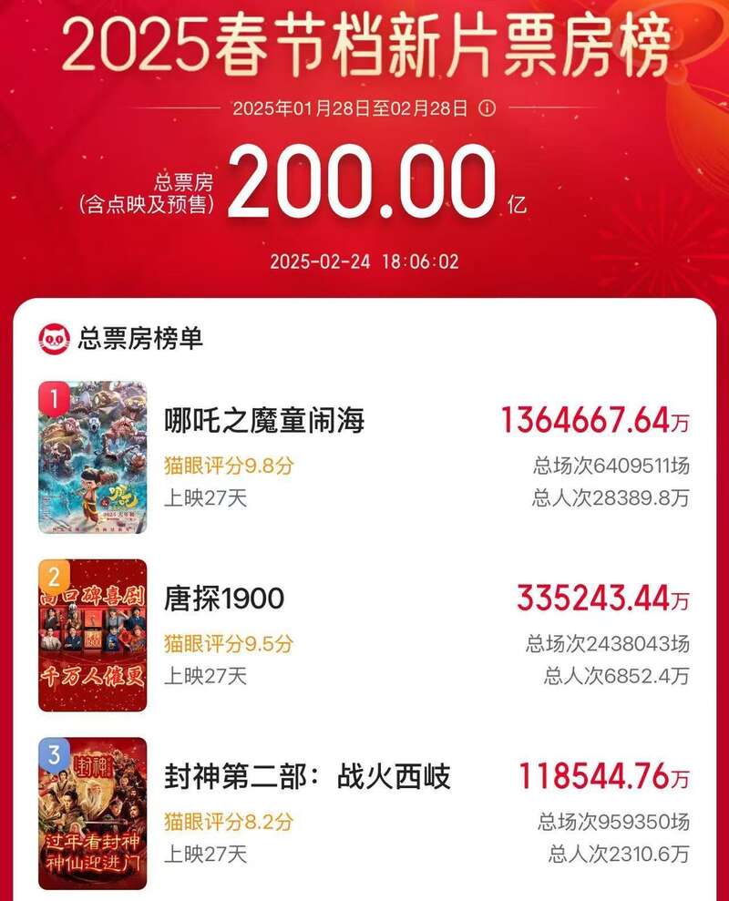 2025春节档新片电影总票房破200亿