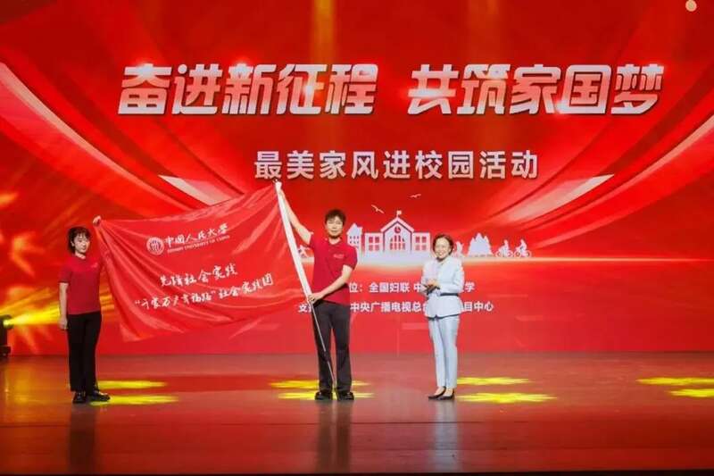 ▲ 2024年“奋进新征程 共筑家国梦”最美家风进校园活动现场,全国妇联党组书记、副主席、书记处第一书记黄晓薇为“千家万户幸福路”先锋社会实践团授旗。