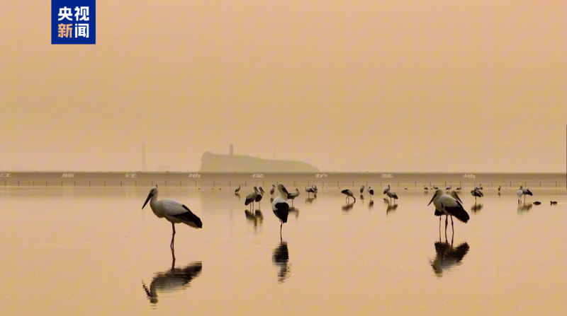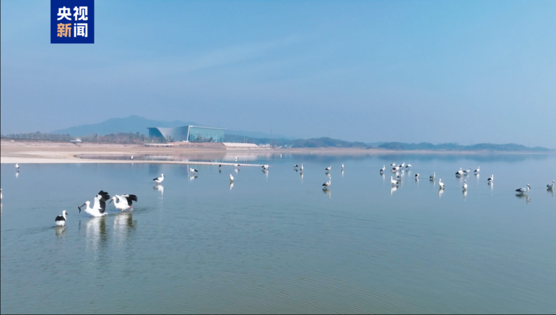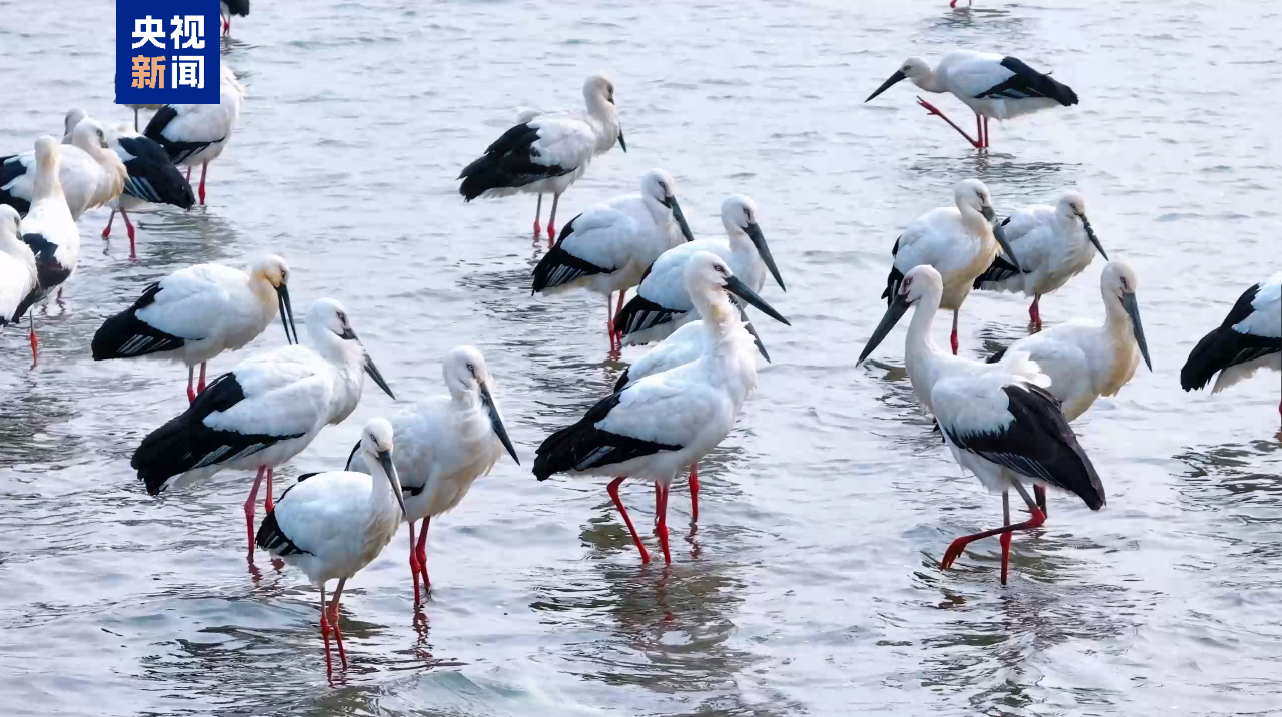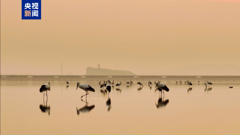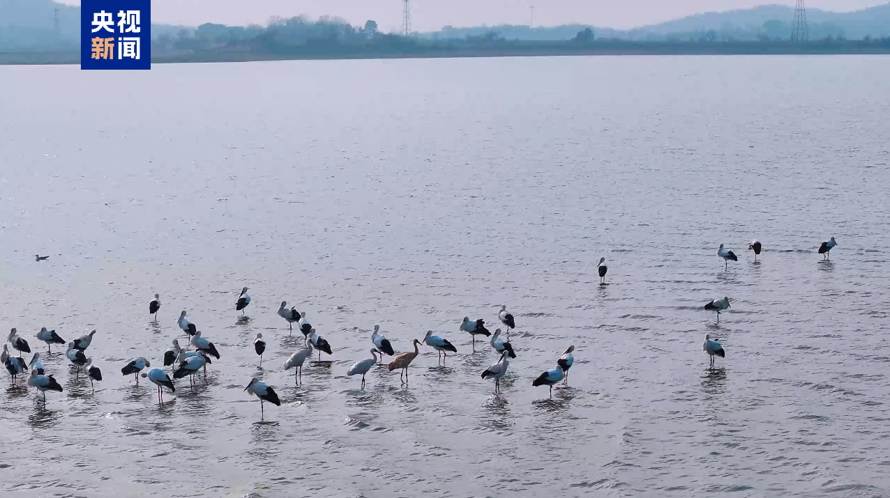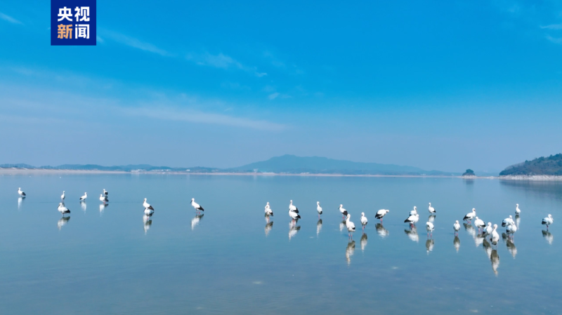 近日,在江西鄱阳湖湖口水域,数百只国家一级保护动物东方白鹳集结于此,在春日暖阳下勾勒出一幅灵动壮美的生态画卷。(总台记者 易文韬 李政)