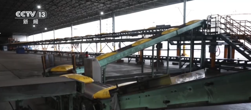 在呼伦贝尔市,阿荣旗站铁路货运场同样繁忙。这列发自鄂尔多斯的满载化肥的农资列车顺利抵达,一袋袋化肥通过自动输送机高效输送至大货车上。