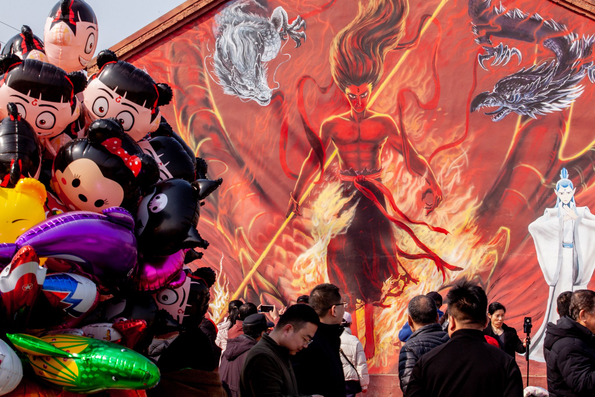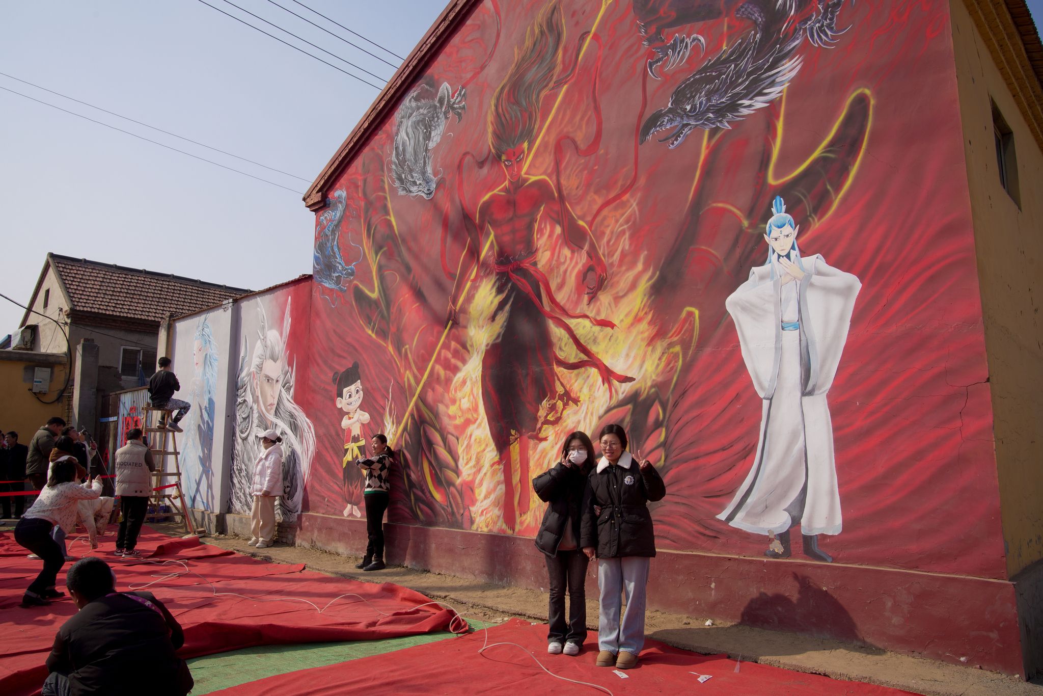 2025年2月25日,山东淄博,人们在周村区沈家村一处哪吒主题墙画前游玩。