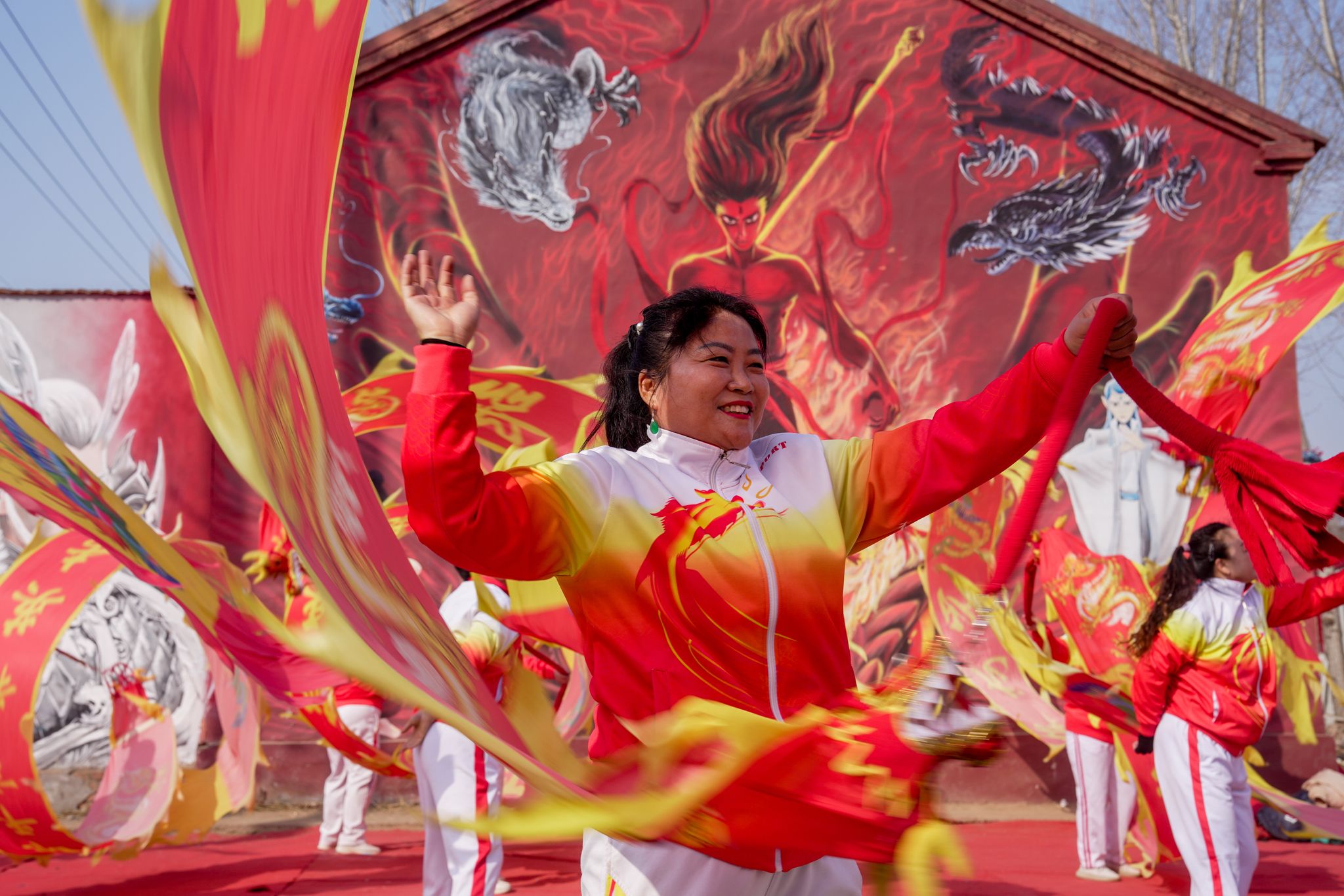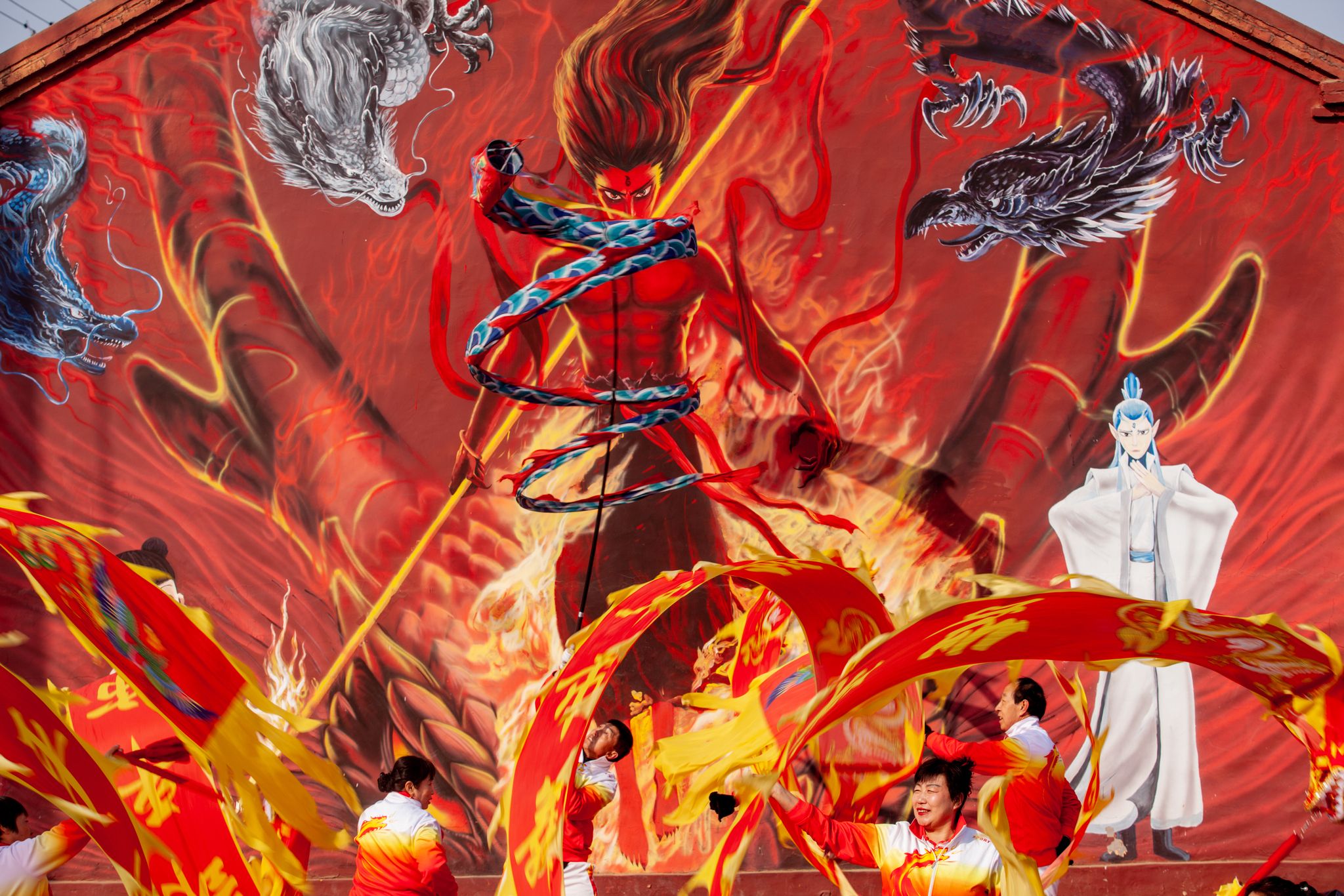 2025年2月25日,山东淄博,人们在周村区沈家村一处哪吒主题墙画前表演传统民俗项目。