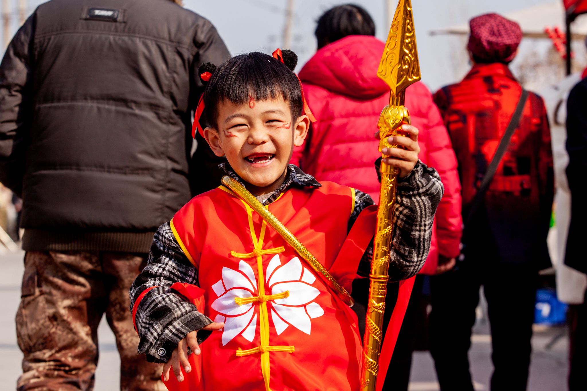 2025年2月25日,山东淄博,一位装扮成哪吒形象的小朋友在周村区沈家村街道上拍照。