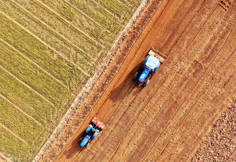 2月18日,山东省临沂市平邑县平邑街道农民驾驶农机在翻耕土地(无人机照片)。新华社发(武纪全 摄)