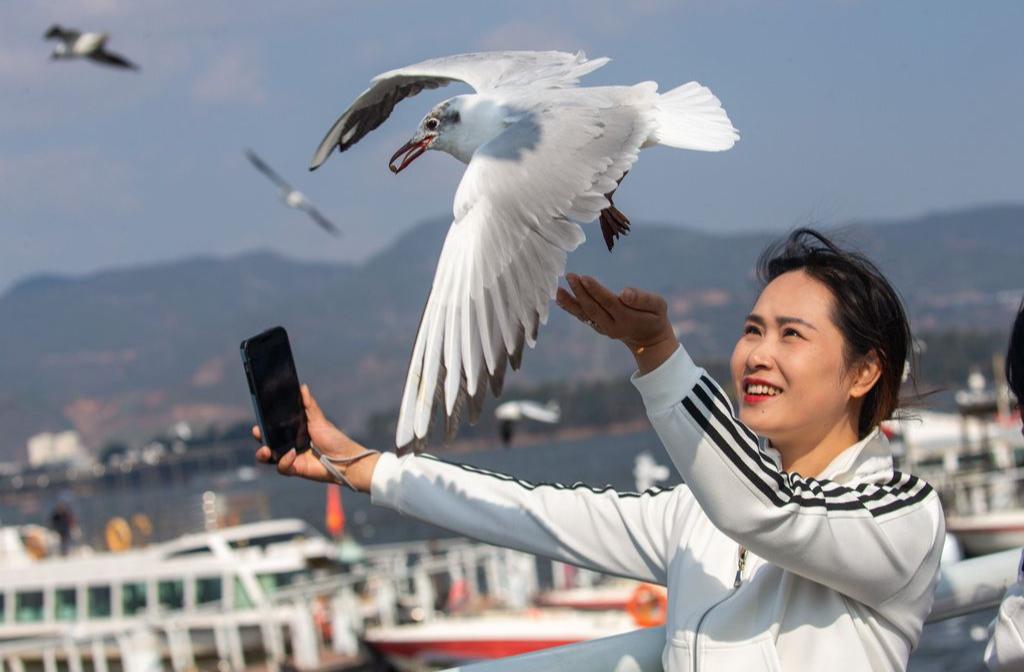 昆明:市民游客海埂大坝观鸟 人与红嘴鸥共舞