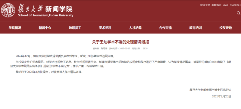 近日,复旦大学校学术规范委员会收到举报,反映一名博士后研究员多次抄袭他人论文,涉嫌学术违规问题。该校新闻传播学博士后流动站25日发布通报称,举报情况属实,流动站已于2025年1月按规定,对被举报人作出退站处理。