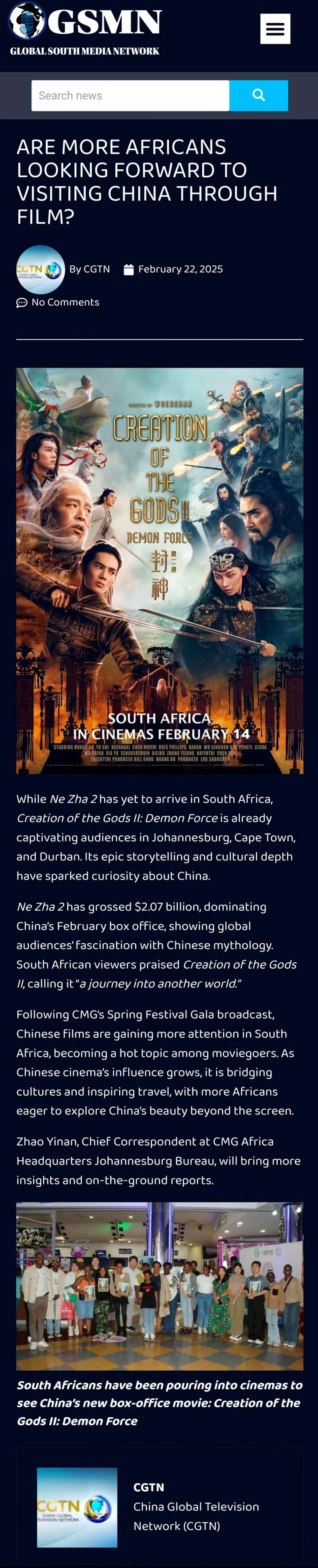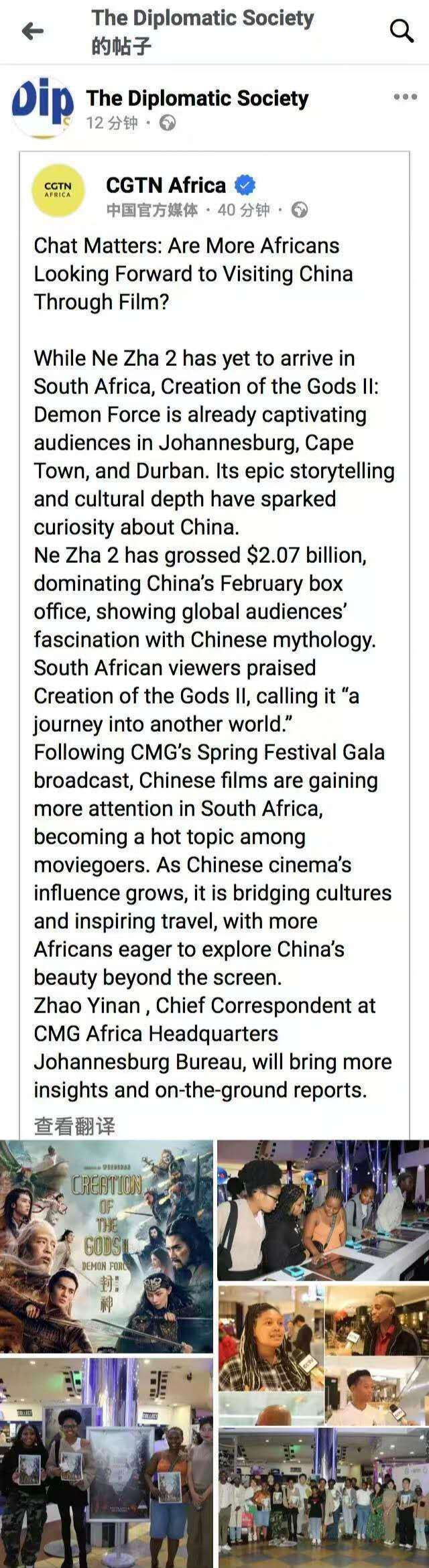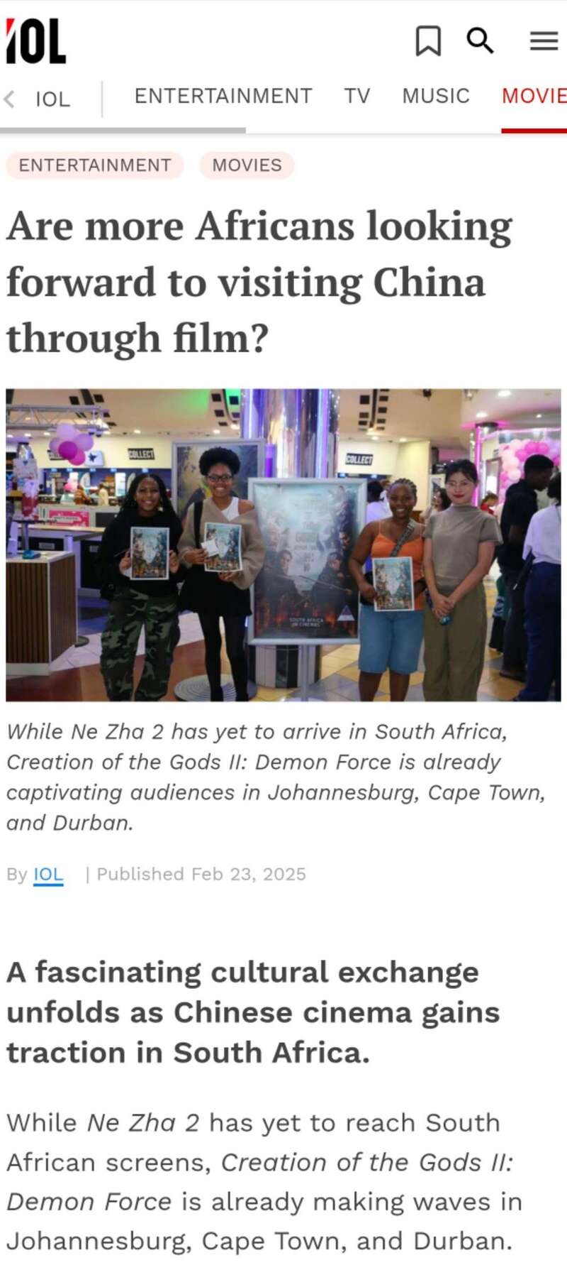 此外,中国春节档电影登陆非洲并引发广泛影响的相关报道被肯尼亚广播公司、南非独立传媒、南非《外交圈报》、全球南方新闻网、赞比亚5fm电台、津巴布韦广播公司、冈比亚之声、刚果新闻网等多家媒体转引转载,触达超1亿受众。