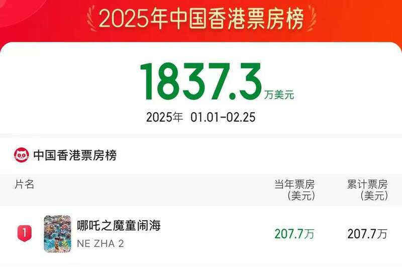 《哪吒2》连续4天位居中国香港单日票房榜榜首