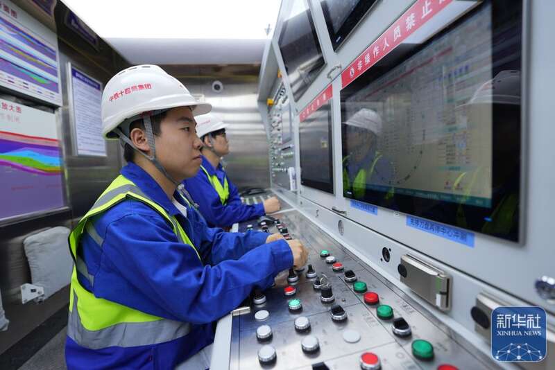 ↑ 2月25日,中铁十四局技术人员在甬舟铁路金塘海底隧道“甬舟号”盾构机操作室关注设备运行情况。