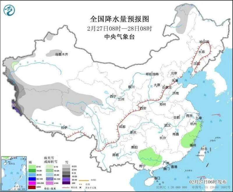 预计今天白天到夜间,内蒙古东北部、黑龙江西北部、新疆西部、西藏西部和北部、青海南部等地部分地区有小到中雪或雨夹雪,其中,新疆南疆西部山区、西藏西部等地部分地区有大到暴雪,局地大暴雪。浙江东部、福建北部、广西中东部等地部分地区有小雨。
