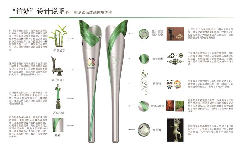 火炬的颜色以绿色和银色为主。绿色代表世界的底色,成都世运会践行绿色低碳理念,公园城市推窗见绿,与世运项目活力场景自然融洽;银色则象征科技与创新、速度与动力。火炬整体象征着中国时时逐“绿”而行、处处向“新”发力,与世界共赴未来。