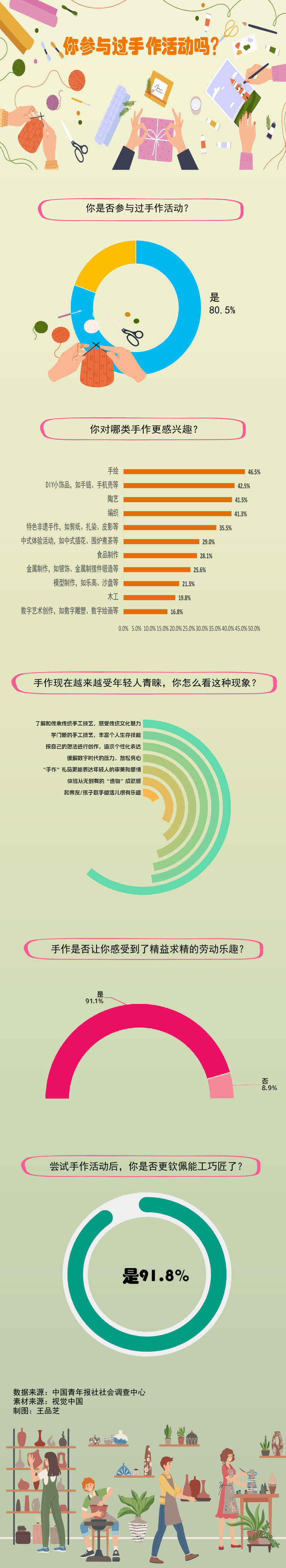 近年来,越来越多年轻人爱上手作活动,享受亲手创作的乐趣,探索约会与休闲的新方式,还在尝试手作的过程中,感受到劳动的乐趣。你体验过手作活动吗?你对哪类手作感兴趣?