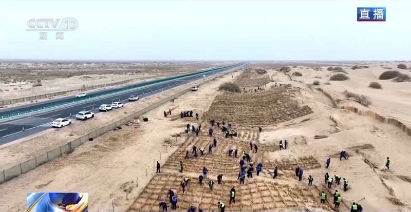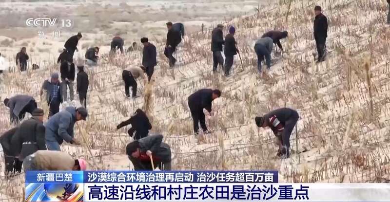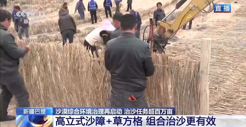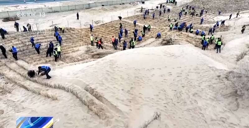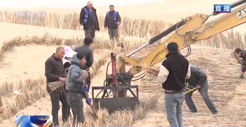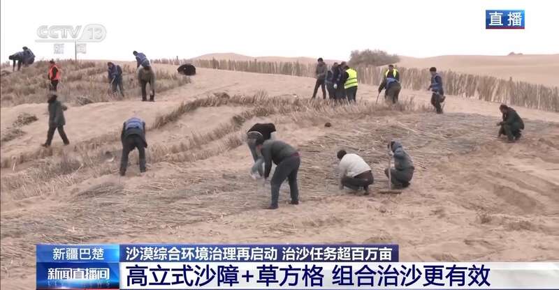 总台记者从新疆巴楚县阿克萨克马热勒乡防沙治沙工程施工现场发回报道。当地的200多名各族干部群众人工铺设“草方格”,也就是将干芦苇铺设在地面,再压进沙土中,它的主要作用是固沙。