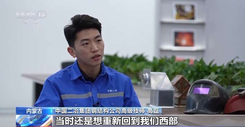 中国二冶集团钢结构公司高级技师 高磊:我是从包头学到的本领、学到的技术,当时还是想重新回到我们西部,回到内蒙古。在这种条件下,通过专业性的技术人才的引进,对我也是一个更好的挑战和一个更好的机遇和平台。