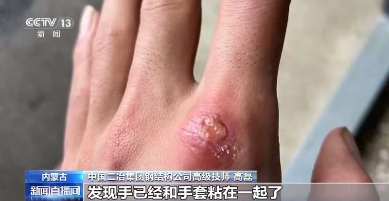 中国二冶集团钢结构公司高级技师 高磊:如果你中途停止的话,再重新起弧就可能造成焊接缺陷,我就没有选择停,我就咬着牙坚持把这段焊缝完成,直到焊到最后,等我往下摘我的焊工手套的时候,发现手已经和手套粘在一起了,烫出特别大一个水泡。