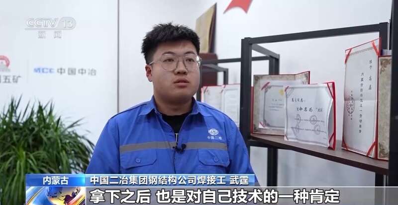 中国二冶集团钢结构公司焊接工 武霆:心里还是很有成就感的。拿下之后也是对自己技术的一种肯定,自己提升技术也是比较好的一个渠道。