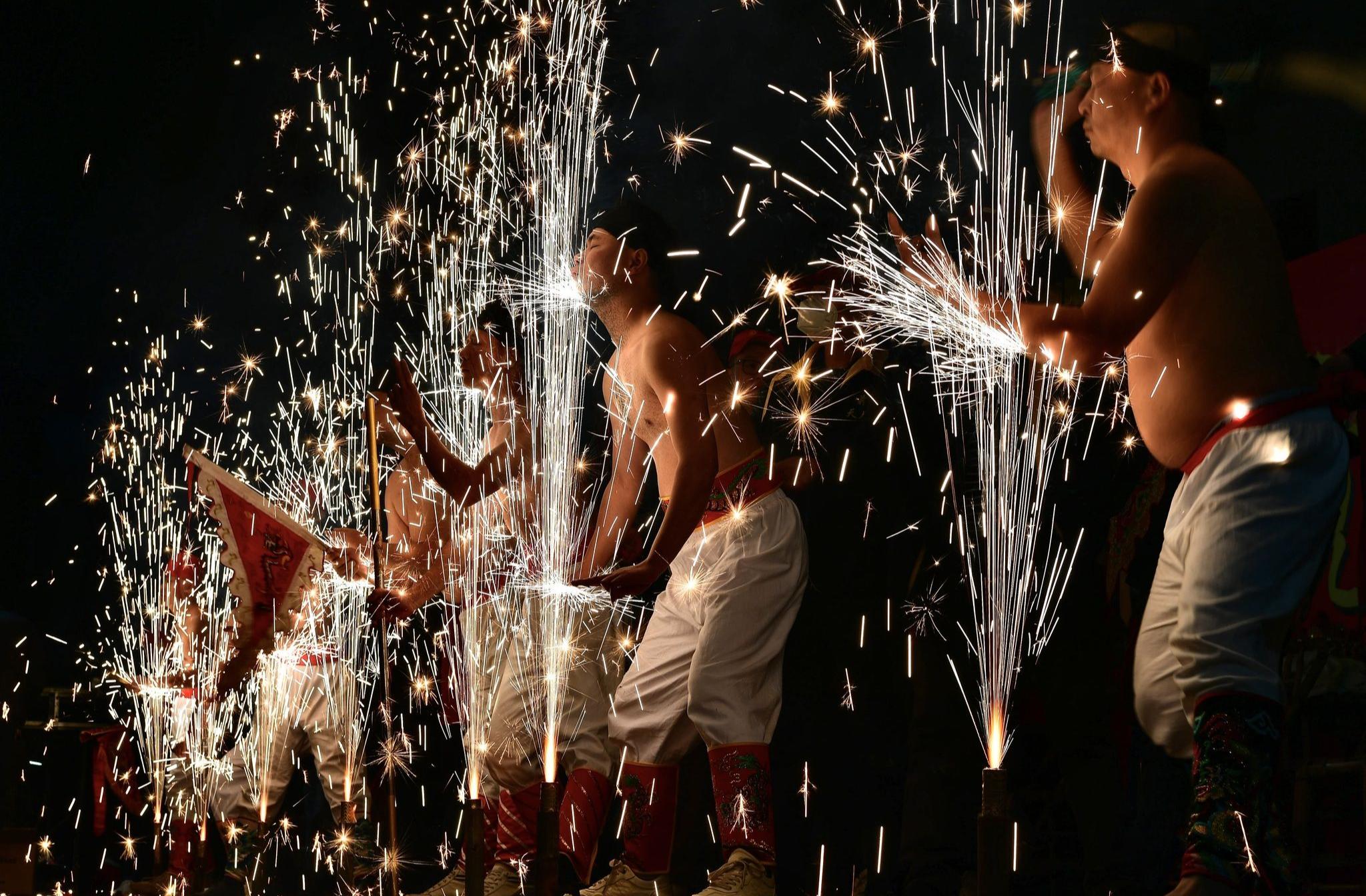 福建莆田:火花四溅 民间艺人赤膊上阵表演“冲花”