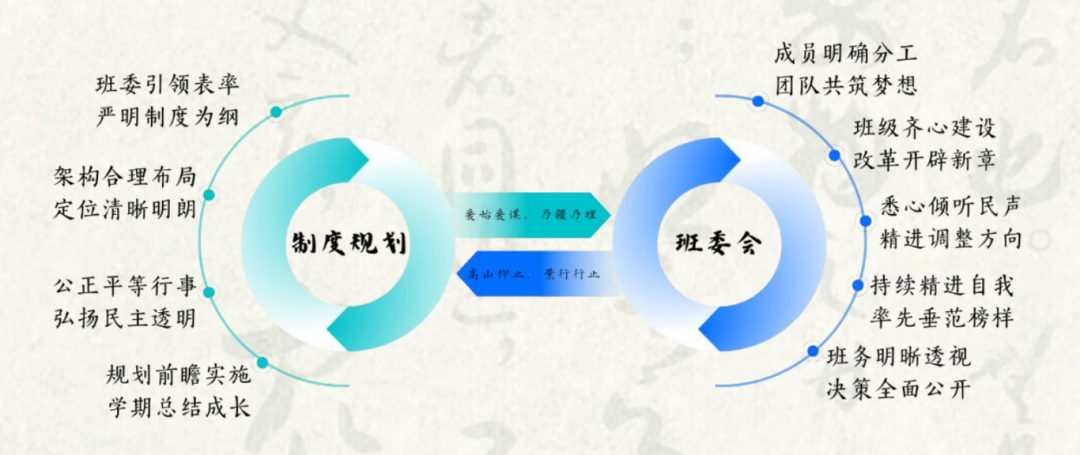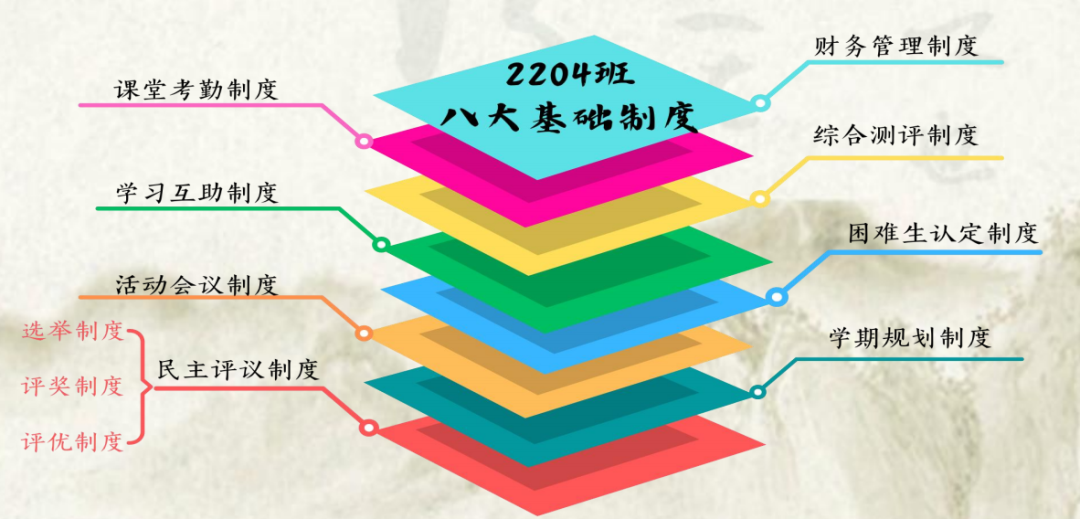 爰始爰谋,乃疆乃理。2204班班团委员会群策群力,紧密结合班级实际情况,精心探索并构建了一系列富有特色的班级规章制度,涵盖课堂考勤、学习互助、活动组织、民主评议、财务管理、综合测评、困难学生帮扶以及学期规划等八大核心领域,班团双核一体,民主考评全面细致。