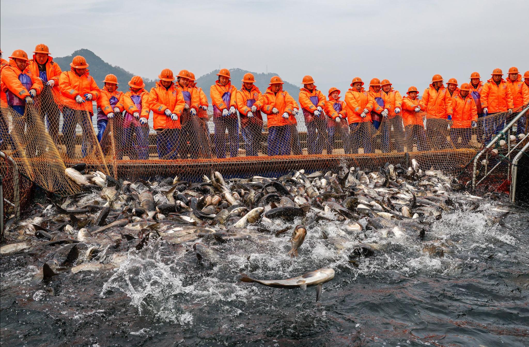 杭州:千岛湖新春首捕 巨网捞出6万斤鱼
