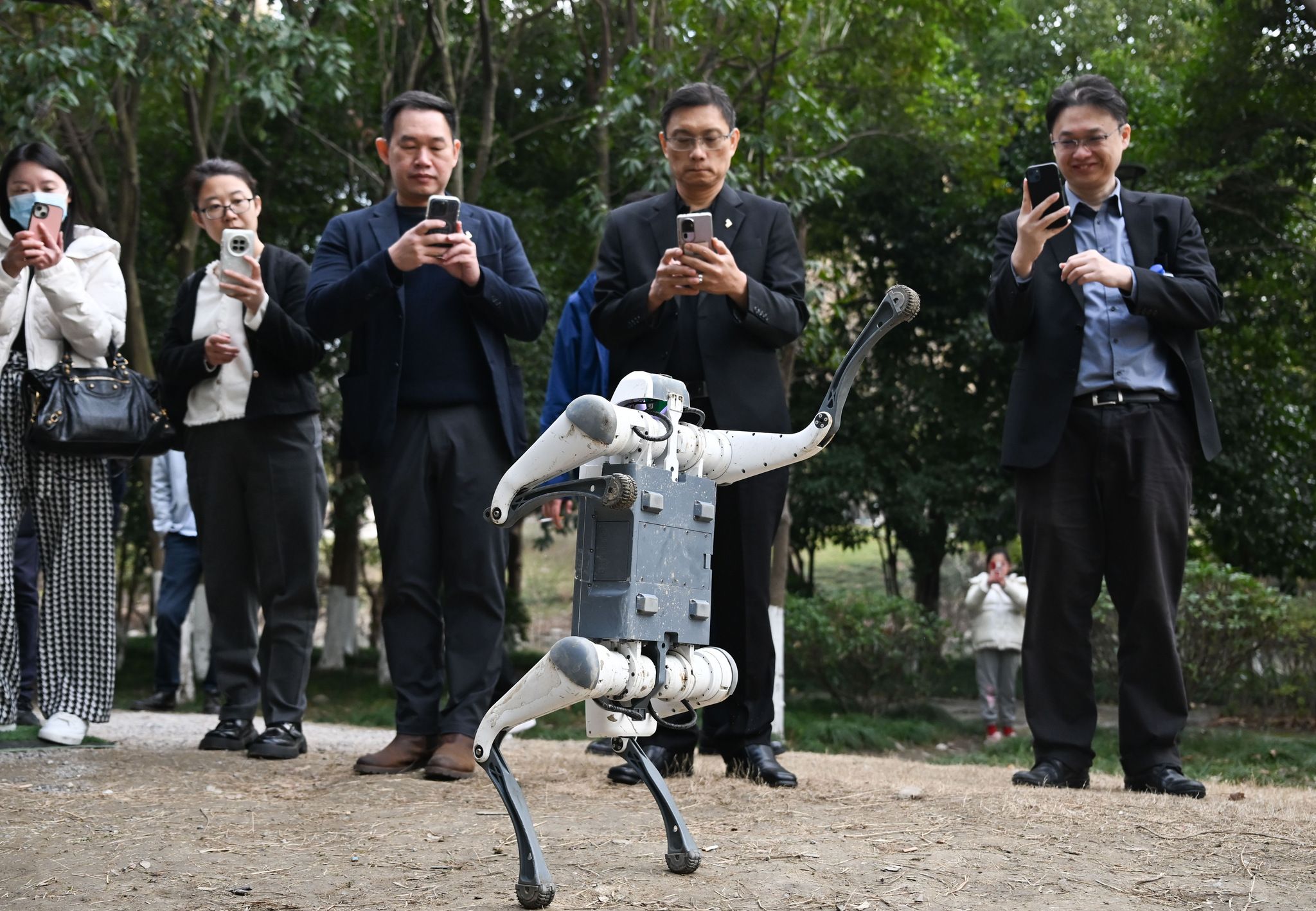 2025年2月27日,四足机器人凌空翻滚吸引参观者。近日,随着“杭州六小龙”在网络走红,其中的浙江杭州云深处科技公司四足机器人等产品颇受关注。目前到访该企业的电力、消防、汽车、文旅等行业的参观团队络绎不绝。 中新社记者 王刚 摄