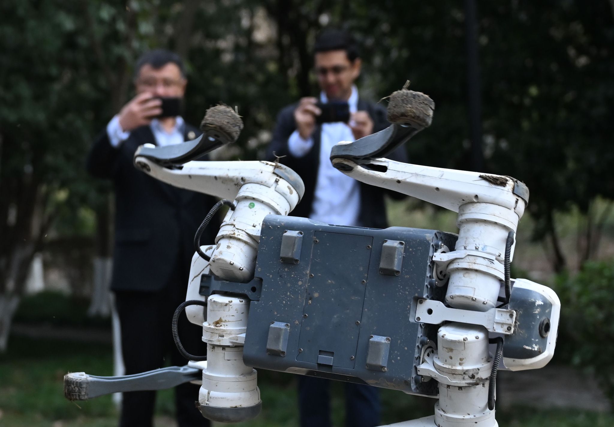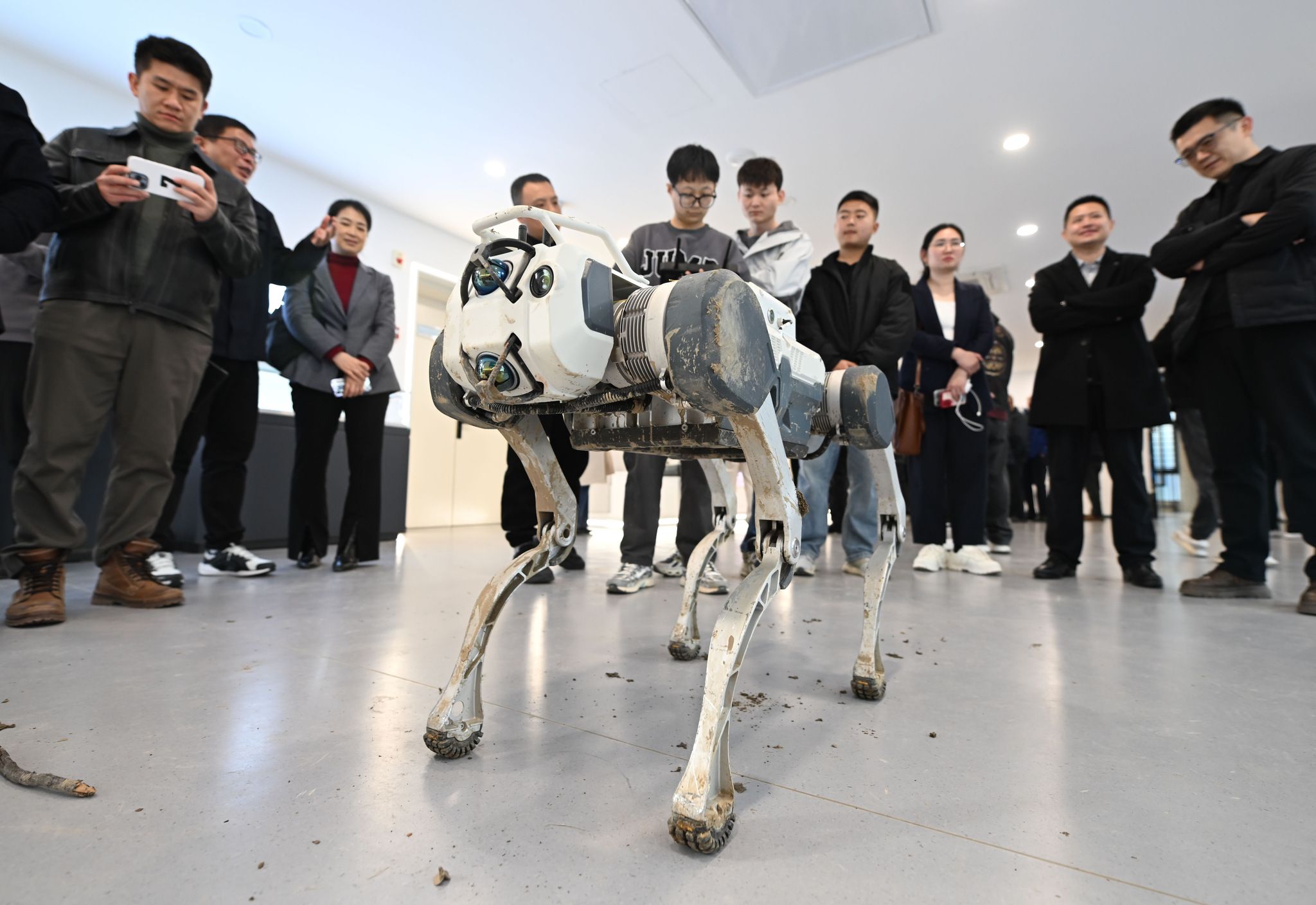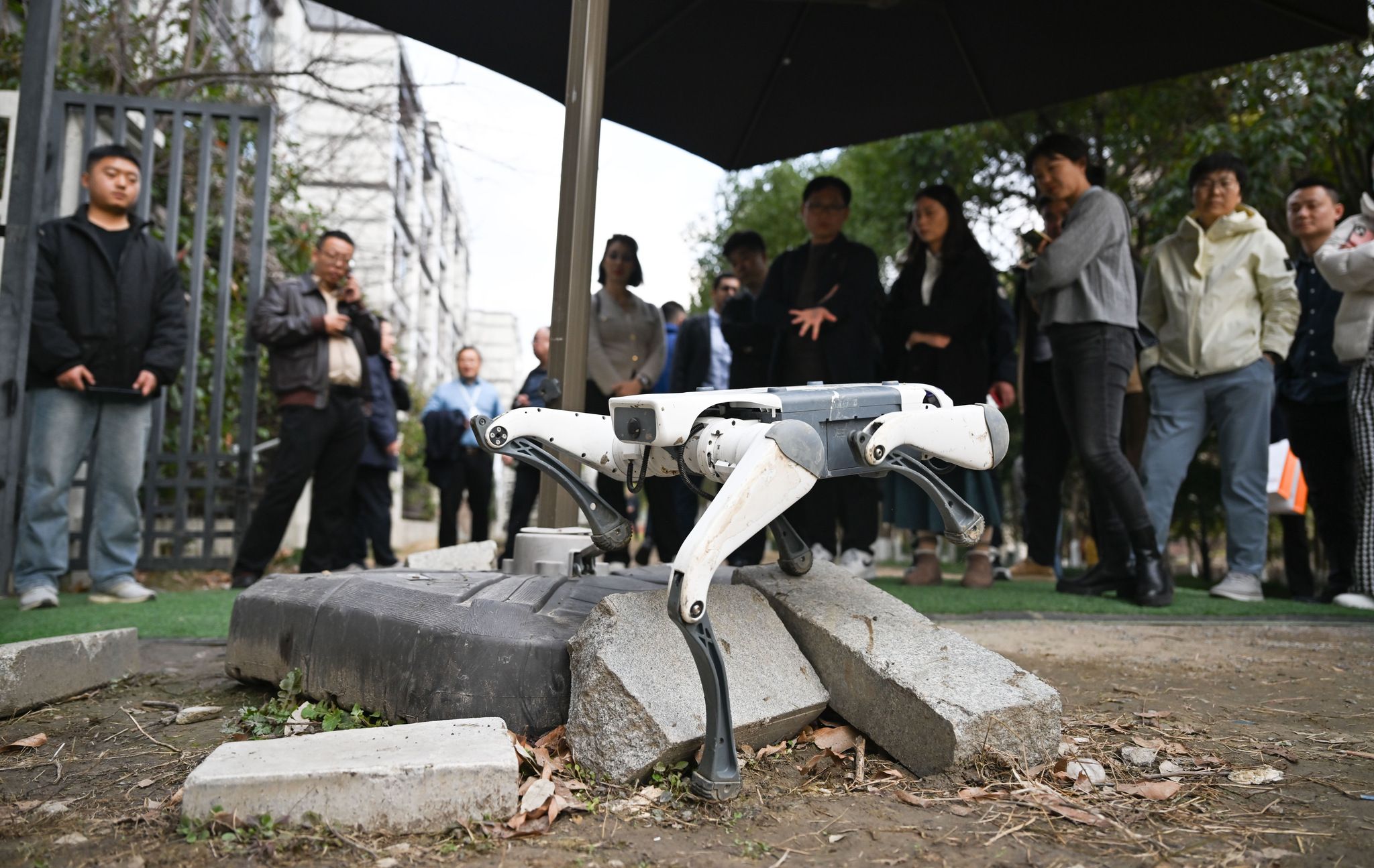 2025年2月27日,四足机器人展示复杂地面的通过能力。近日,随着“杭州六小龙”在网络走红,其中的浙江杭州云深处科技公司四足机器人等产品颇受关注。目前到访该企业的电力、消防、汽车、文旅等行业的参观团队络绎不绝。 中新社记者 王刚 摄