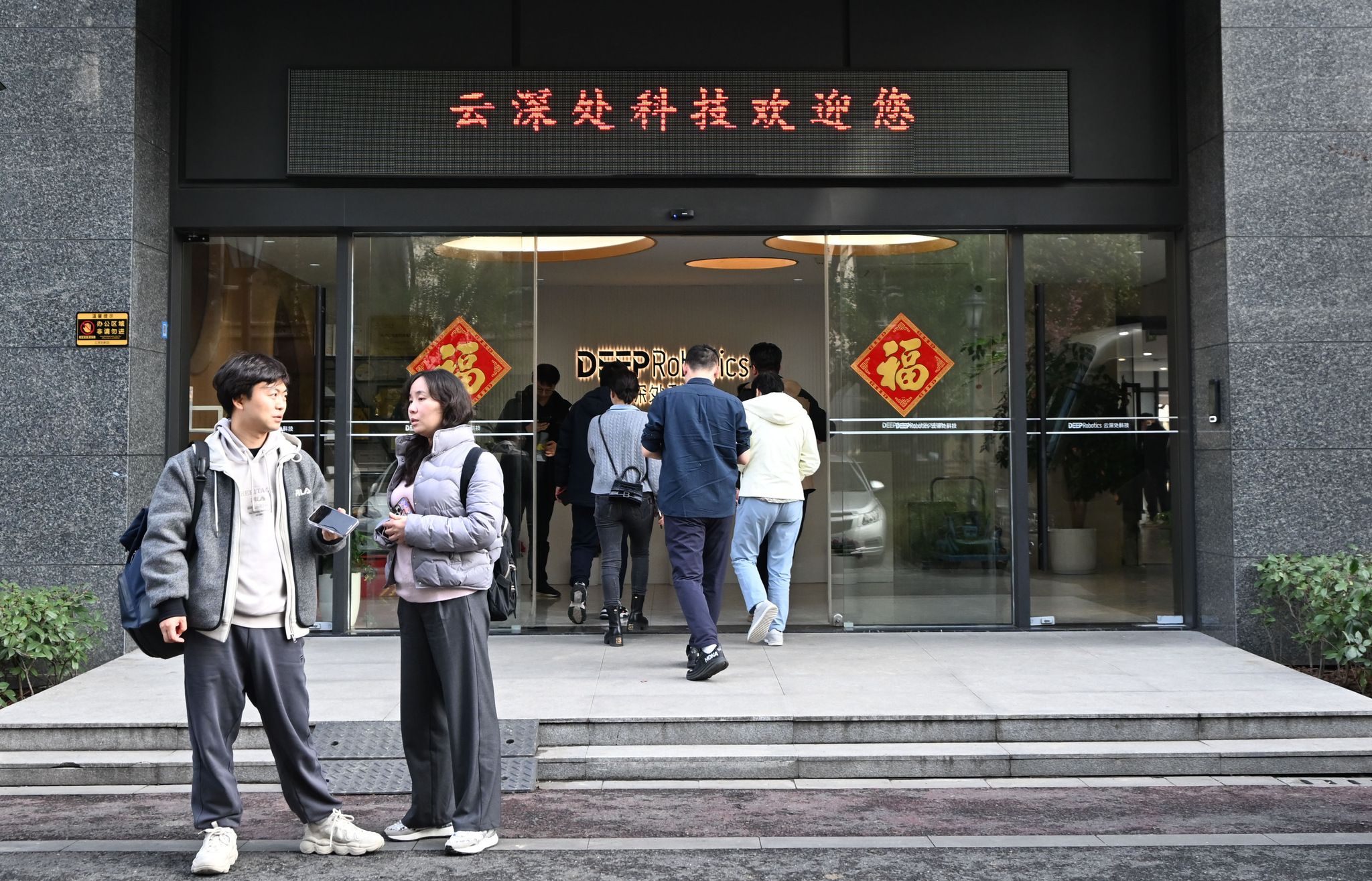 2025年2月27日,杭州云深处科技公司门口参观者接踵而来。近日,随着“杭州六小龙”在网络走红,其中的浙江杭州云深处科技公司四足机器人等产品颇受关注。目前到访该企业的电力、消防、汽车、文旅等行业的参观团队络绎不绝。 中新社记者 王刚 摄
