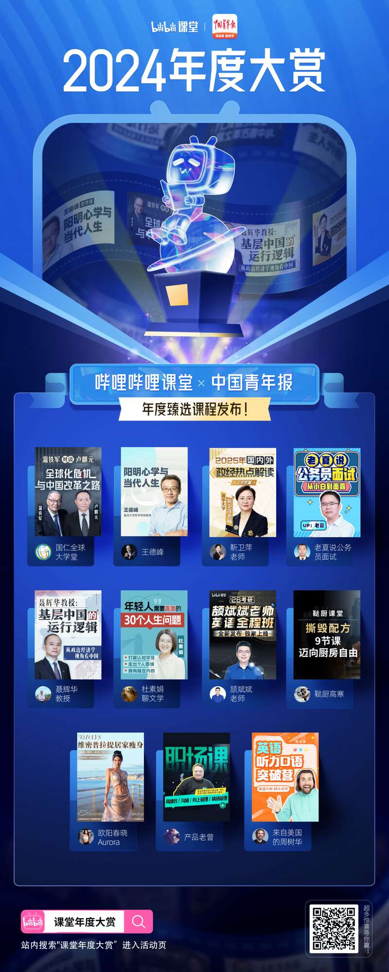 作为Z世代聚集的文化社区,哔哩哔哩课堂已上线近30000门课程,覆盖通识科普、兴趣生活、个人成长、语言学习、考研、考试考证、职业职场、IT互联网、影视创作九大领域,吸引罗翔、戴建业等学者及上千名UP主入驻。此次甄选课程的发布,不仅助力优质内容传播,更帮助激发青年用户的学习内驱力。