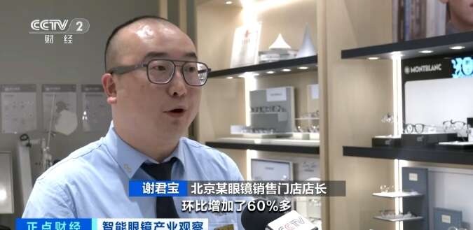 北京某眼镜销售门店店长 谢君宝:我们在全国100多家门店,铺设了有智能眼镜的专柜,销量环比增长了60%多,以上班族、开车族、喜欢科技产品的消费群体为主。