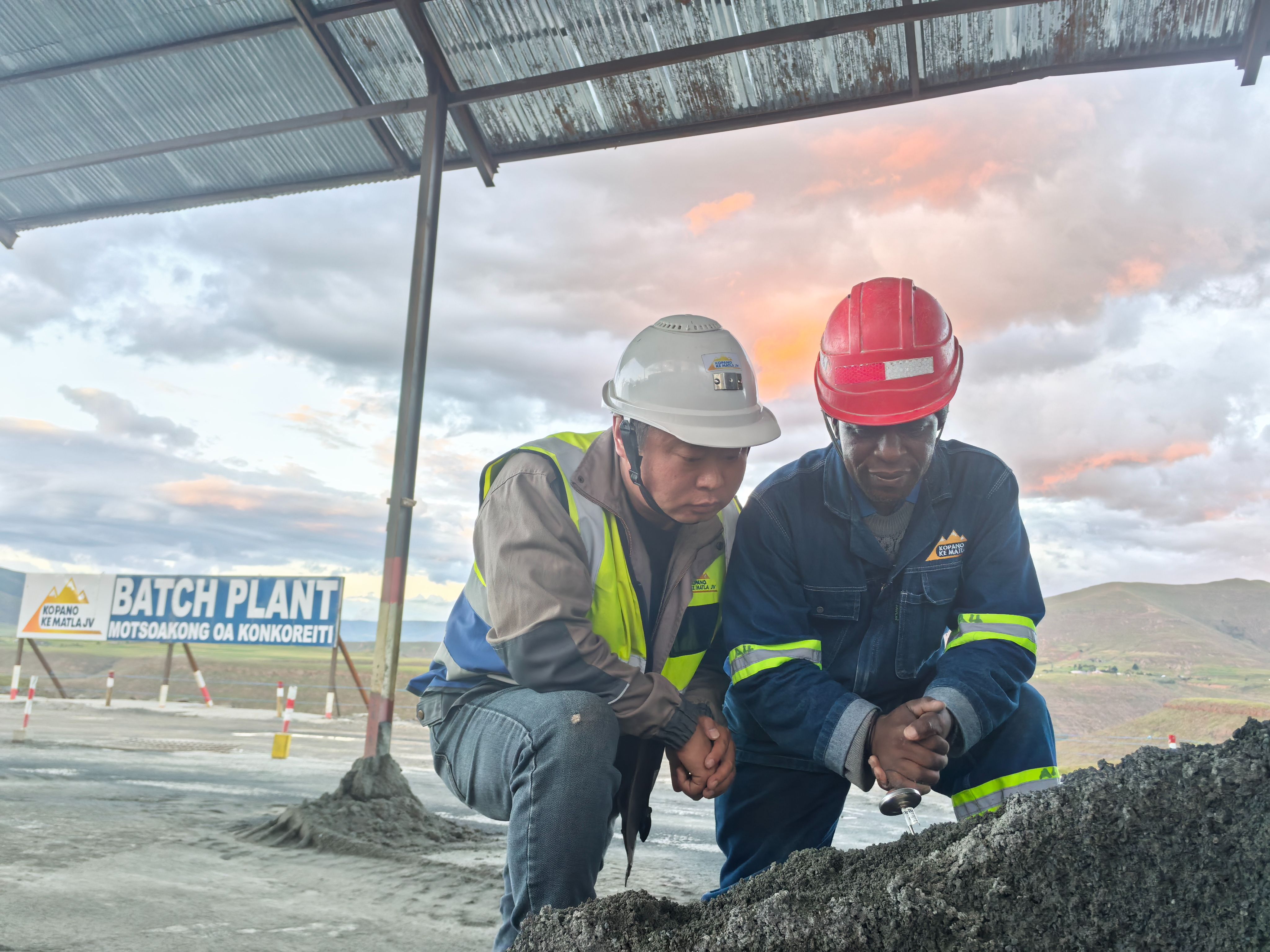 2 月 25 日,莱索托,中国水利水电第十一工程局有限公司莱索托波利哈利输水隧洞项目试验室副主任何腾飞(左)与当地职工合作做试验。 中国水利水电第十一工程局有限公司供图