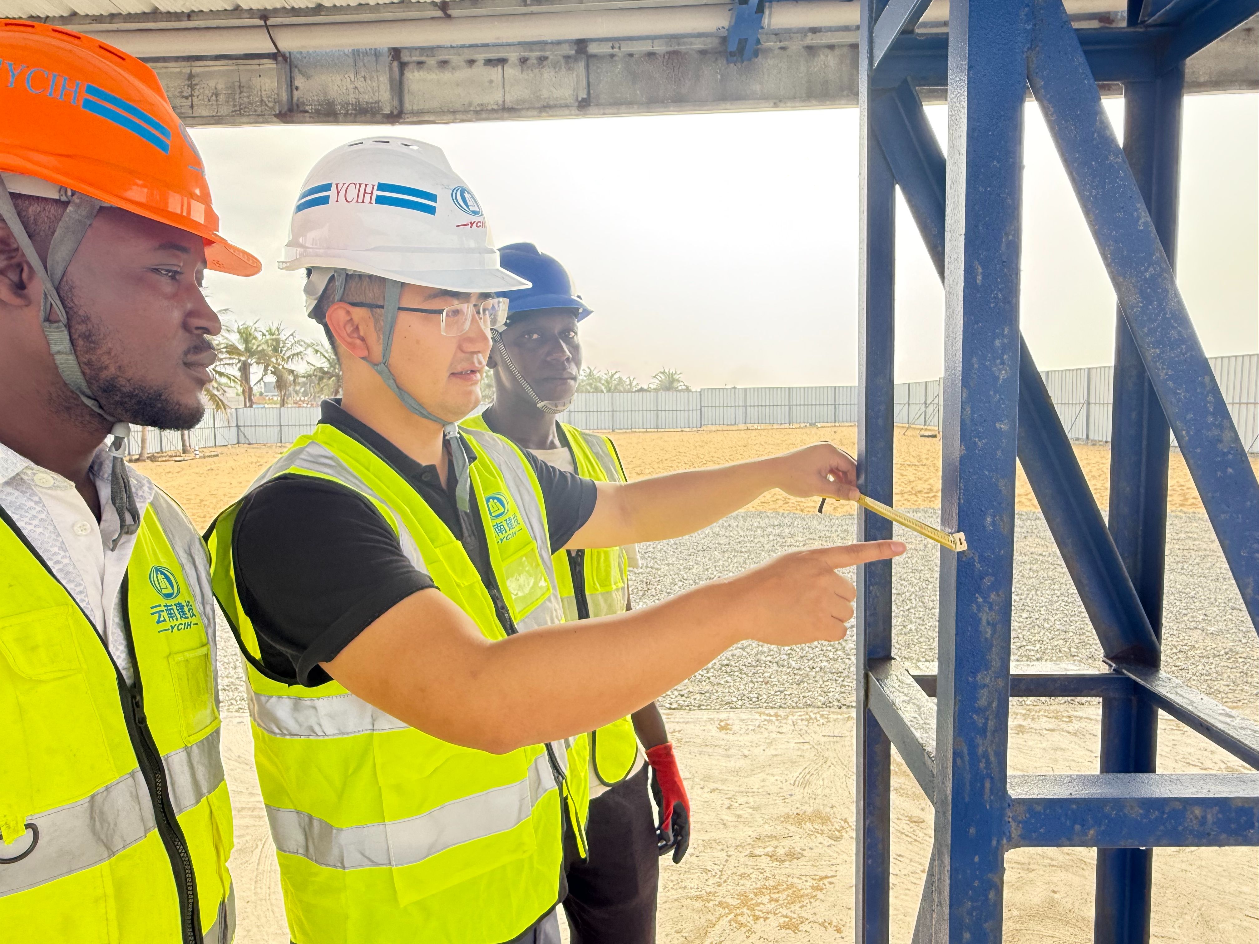 1 月 15 日,贝宁维达海滨项目餐厅钢筋加工棚,云南省建设投资控股集团有限公司国际部 (海投公司) 贝宁赤几联合分公司经理赵炫(中)在进行钢结构尺寸检测。云南省建设投资控股集团有限公司供图