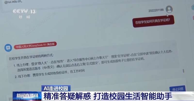 接入“DeepSeek”不仅服务教学,还让校园生活更智慧。在中国人民大学的数字平台上,公共管理学院的大三学生罗安源点击“e问e答服务平台”版块,输入“如何开具在学证明”的提问,就可以迅速得到回答,现已覆盖1300多条校内服务方面的诉求。