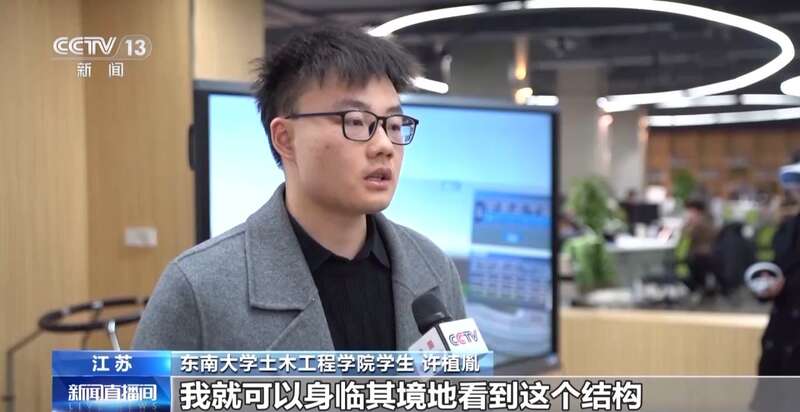 东南大学土木工程学院学生 许植胤:刚才对这个结构进行了一定的优化设计,改变了它的索的截面。因为戴了一个VR眼镜,就可以身临其境看到这个结构。在我的设计下,它有一个怎么样的反应,它可以抵抗什么样的荷载,都是可以随时改变的。
