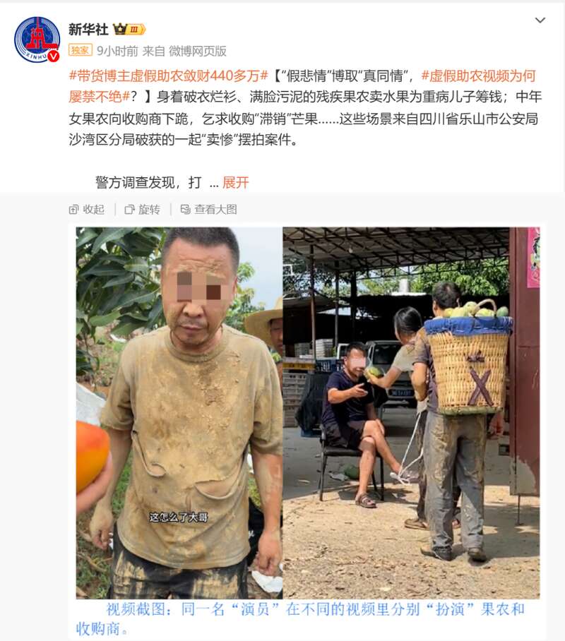 据新华社,身着破衣烂衫、满脸污泥的残疾果农卖水果为重病儿子筹钱;中年女果农向收购商下跪,乞求收购“滞销”芒果……这些场景来自四川省乐山市公安局沙湾区分局破获的一起“卖惨”摆拍案件。