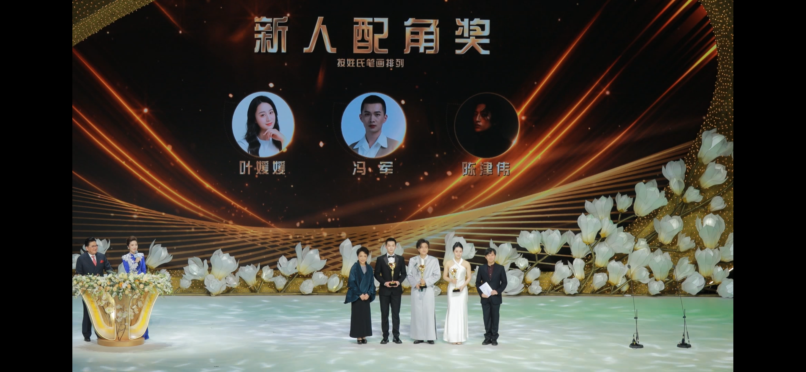 来自江苏省演艺集团歌剧舞剧团的青年演员陈津伟,代表新人配角奖发言。他出身于淮剧世家,父亲陈明矿、母亲陈澄、外公陈德林、外婆黄素萍都是白玉兰奖得主。而这一次,一家三代一起出现在白玉兰的红毯上,共同见证这个夜晚。