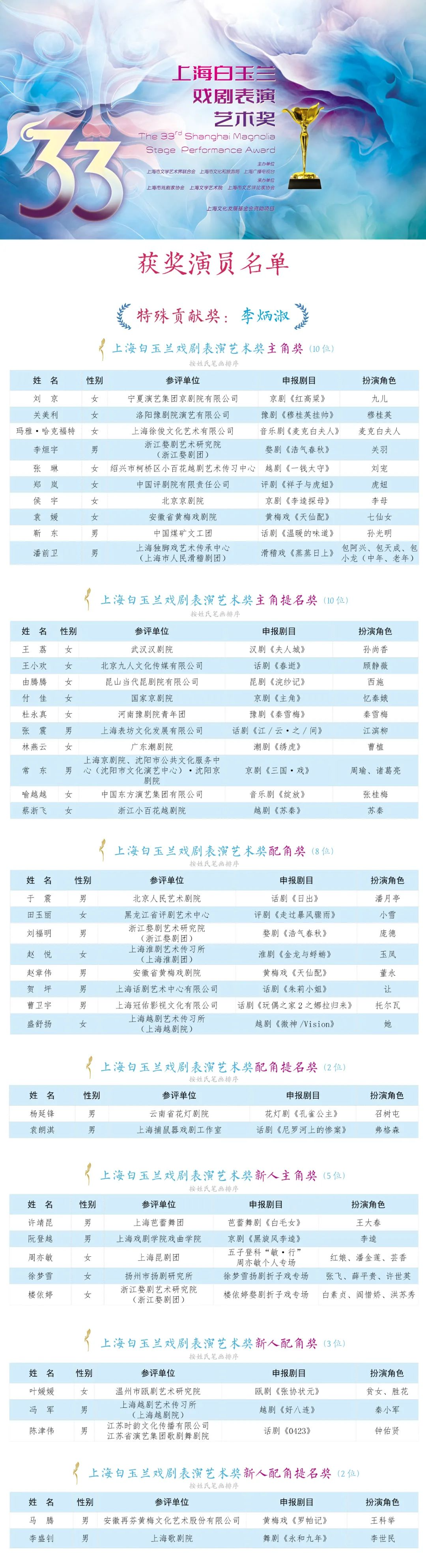 附:第33届上海白玉兰戏剧表演艺术奖 获奖演员名单