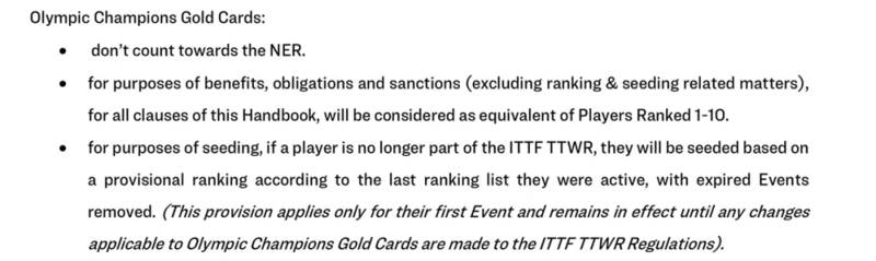 当地时间2月27日,WTT世界乒联在其官方网站上更新了2025年WTT系列相关赛事手册内容。值得一提的是,该新版《赛事手册》加入了奥运冠军金卡(Olympic Champions Gold Cards)内容,这也意味着最近一届的奥运会冠军将受邀参加WTT大满贯赛正赛以及冠军赛的赛事。另外,本次更新后的手册规则将在2025年4月1日起正式生效。