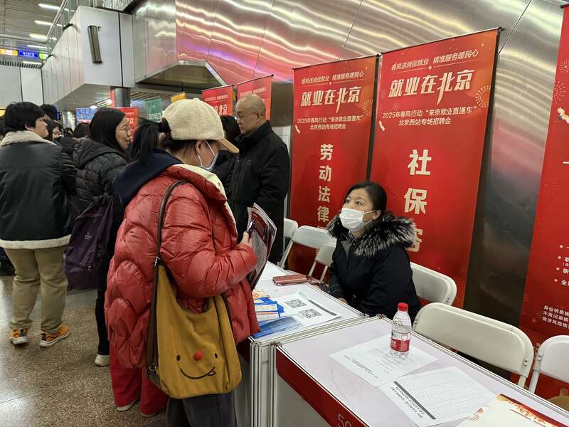 2月28日,北京市人力资源和社会保障局联合北京市重点站区管理委员会,在北京西站举办2025年春风行动“来京就业直通车”专场招聘会,中国电子产业工程有限公司、北京振远护卫有限公司、北京物美综合超市有限公司等近百家企业提供市场策划、景区运营管理师、家政、安保等岗位3000余个。