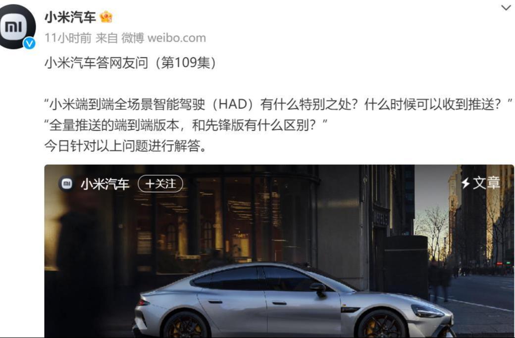 小米汽车:安全智驾里程超1000km才能使用HAD功能