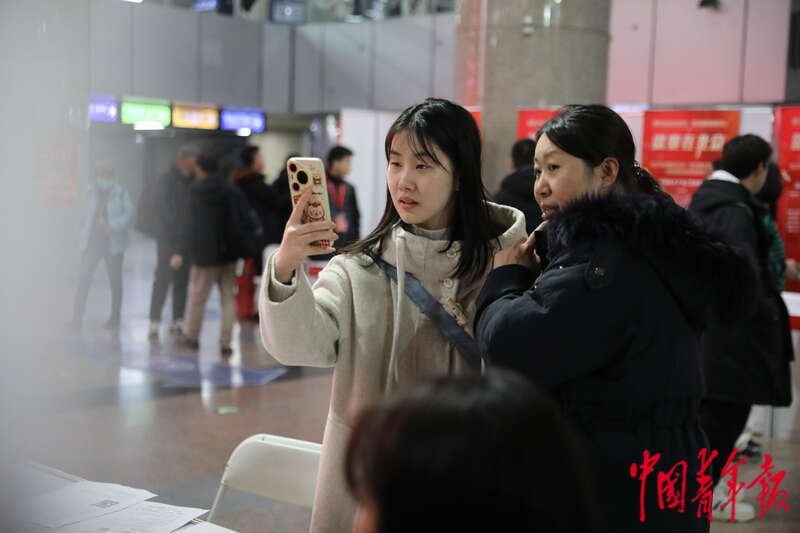 2月28日,北京西站,2025年春风行动“来京就业直通车”专场招聘会上,求职者拍照记录感兴趣的岗位信息。中青报·中青网记者 孔斯琪/摄