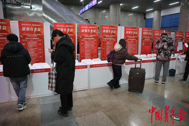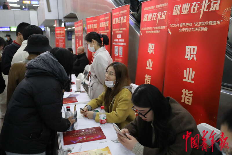 近期正值务工人员返京复工的高峰期,2025年春风行动“来京就业直通车”专场招聘会当日走进北京西站,近百家企业提供包括市场策划、景区运营管理师、家政、安保等在内的3000余个岗位,不仅让刚下火车的旅客实现“出站即求职”,还吸引了许多北京市内的求职者特地赶来参加。中青报·中青网记者 孔斯琪/摄