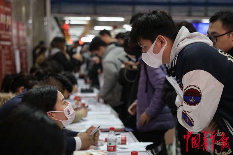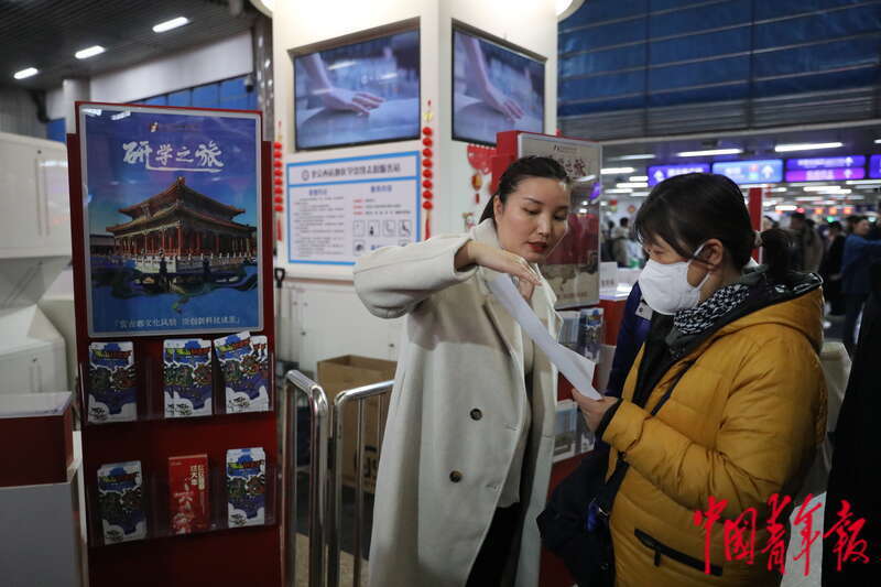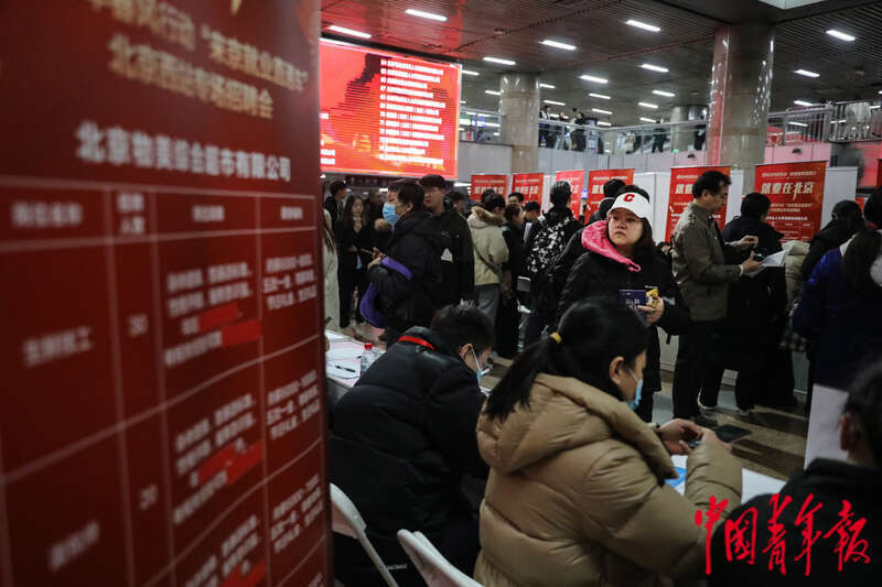 2月28日,北京西站,北京市内的求职者和刚下火车的旅客在招聘会现场与用人单位面对面交流。中青报·中青网记者 孔斯琪/摄