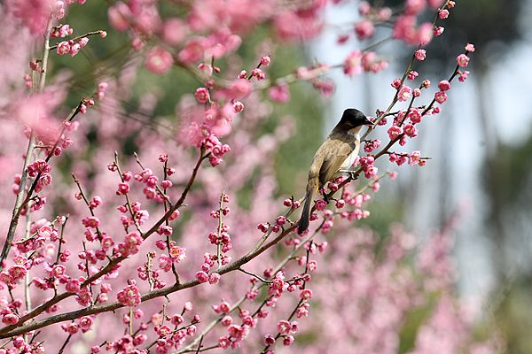 2025年2月28日,贵州省仁怀市楠竹林公园,小鸟在梅花枝头停歇。